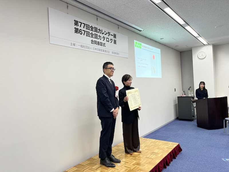 2025年11月7日には、同社からアートディレクター/デザイナーの安井和男氏と製造本部 制作第1部 POD課の伊藤光輝係長の2氏、そしてアール・ブリュット作家の荒木麻奈さんとお母様のゆかりさん、また、富士フイルムビジネスイノベーション(株)からはグラフィックコミュニケーション事業本部 デジタルプリンティング事業部 デジタルプリンティング第四統括部の鈴木祥子部長ほか、担当スタッフらが出席のもと表彰式が執り行われた。