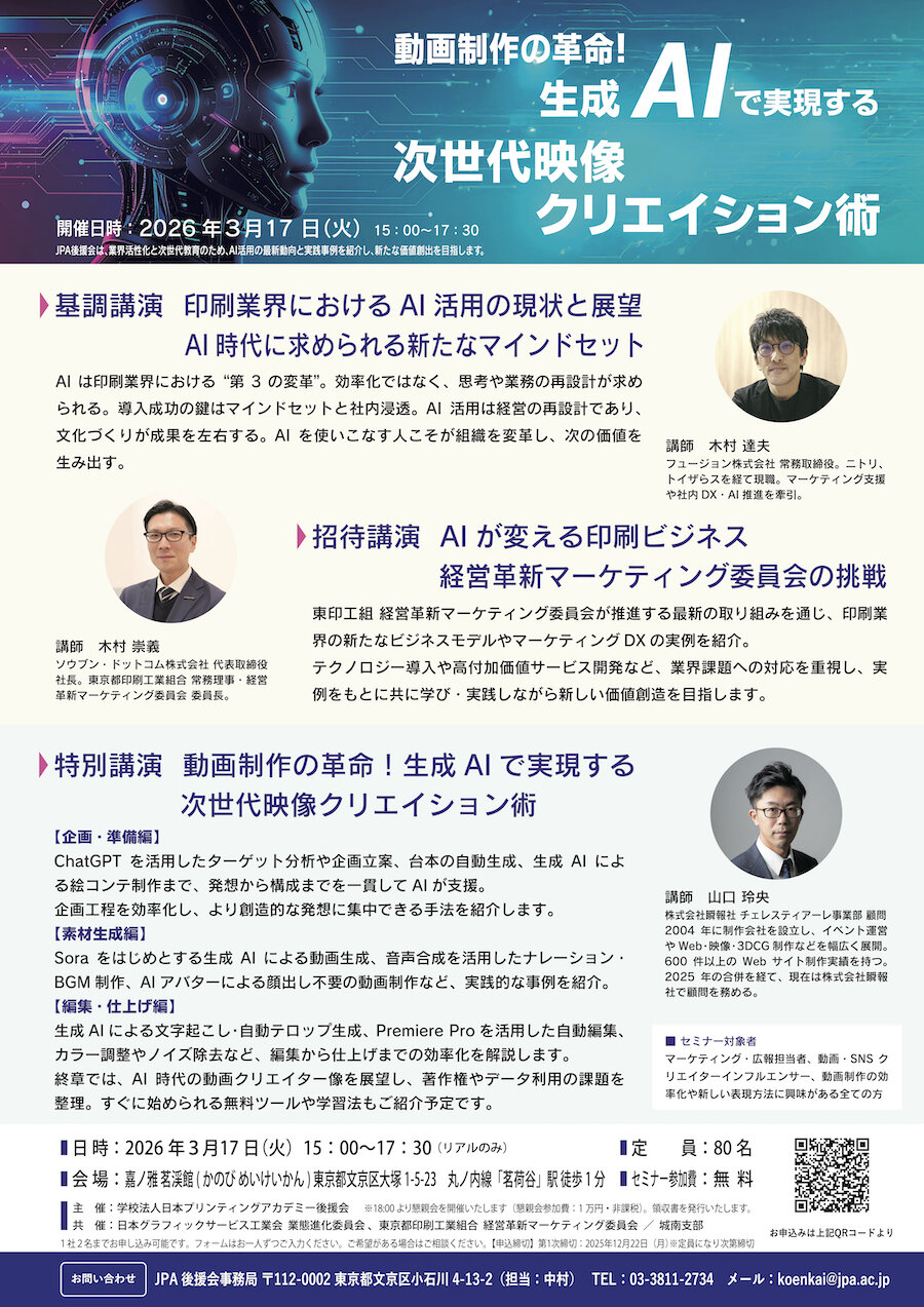 JPA後援会(浅野健会長)は2026年3月17日、東京都文京区の嘉ノ雅 茗渓館においてAIセミナー「動画制作の革命!生成AIで実現する次世代映像クリエイション術」を開催する。