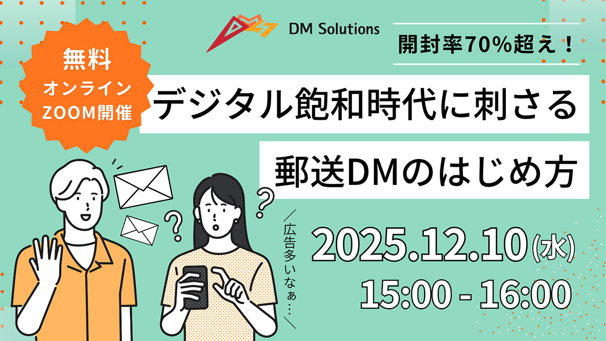 DMソリューションズ、「デジタル飽和時代に刺さる」DM無料ウェビナー開催 2025年11月28日12時37分 イベント Tweet 「開封率70%超え!デジタル飽和時代に刺さる郵送DM発送のはじめ方」 閉じる ダイレクトメール発注のWebサイト「セルマーケ」を運営するディーエムソリューションズ(株)(本社/東京都武蔵野市)は、12月10日15時からZoomによるオンライン形式で無料ウェビナー「開封率70%超え!デジタル飽和時代に刺さる郵送DM発送のはじめ方」を開催する。 DM施策をはじめたい企業や既にDMを発送しているけど、今のやり方に疑問や懸念を持つ企業向けのウェビナー。失敗しない郵送DMの手順やノウハウを誰でもわかるように手順を追って解説する。 ウェビナーの視聴予約はWebサイトから。