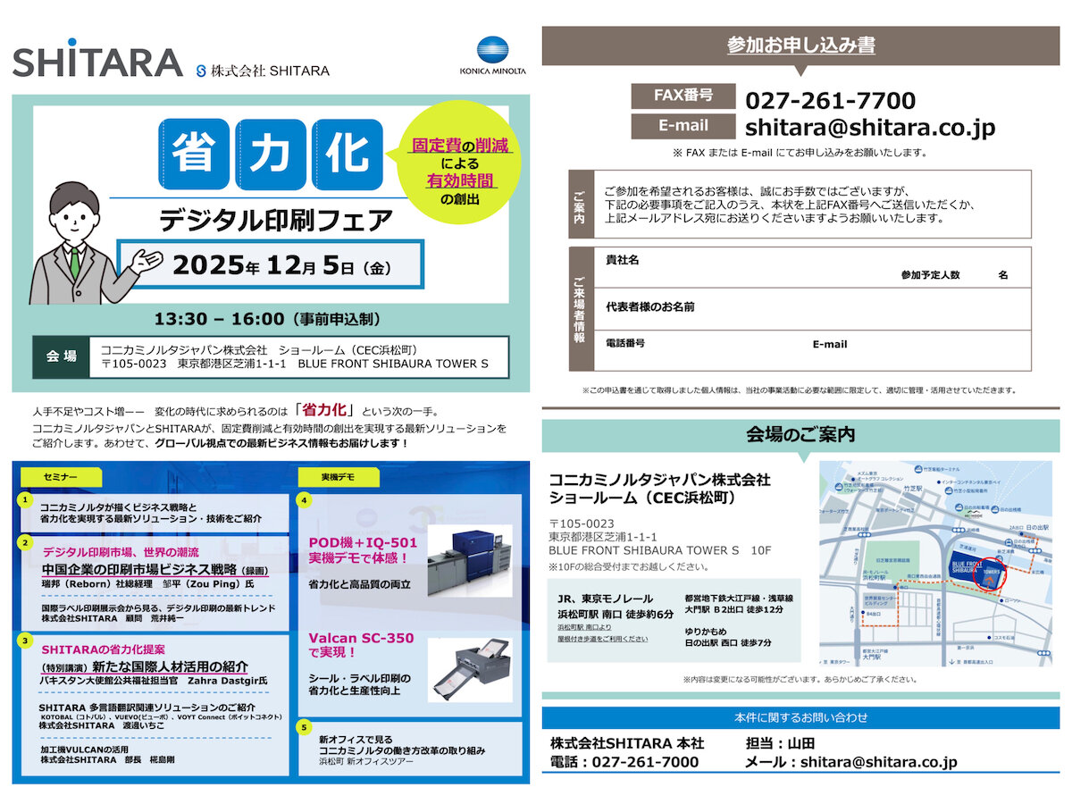 (株)SHITARAとコニカミノルタジャパン(株)の共催による「省力化〜デジタル印刷フェア」の開催(12月5日)が目前に迫ってきた。