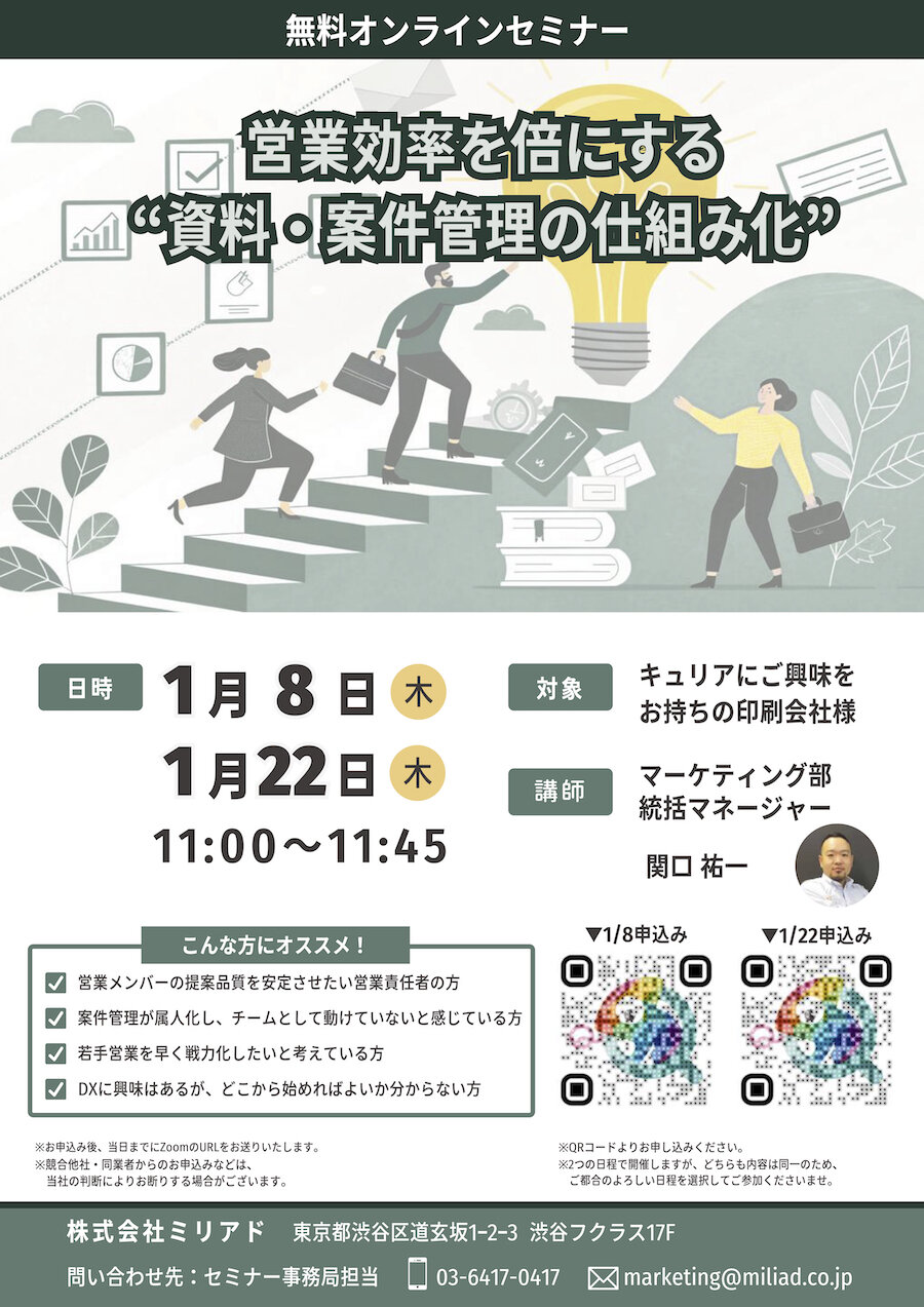 (株)ミリアドは、2026年1月8日と22日の2回にわたり、無料オンラインセミナー「営業効率を倍にする"資料・案件管理の仕組み化"セミナー」を開催する。