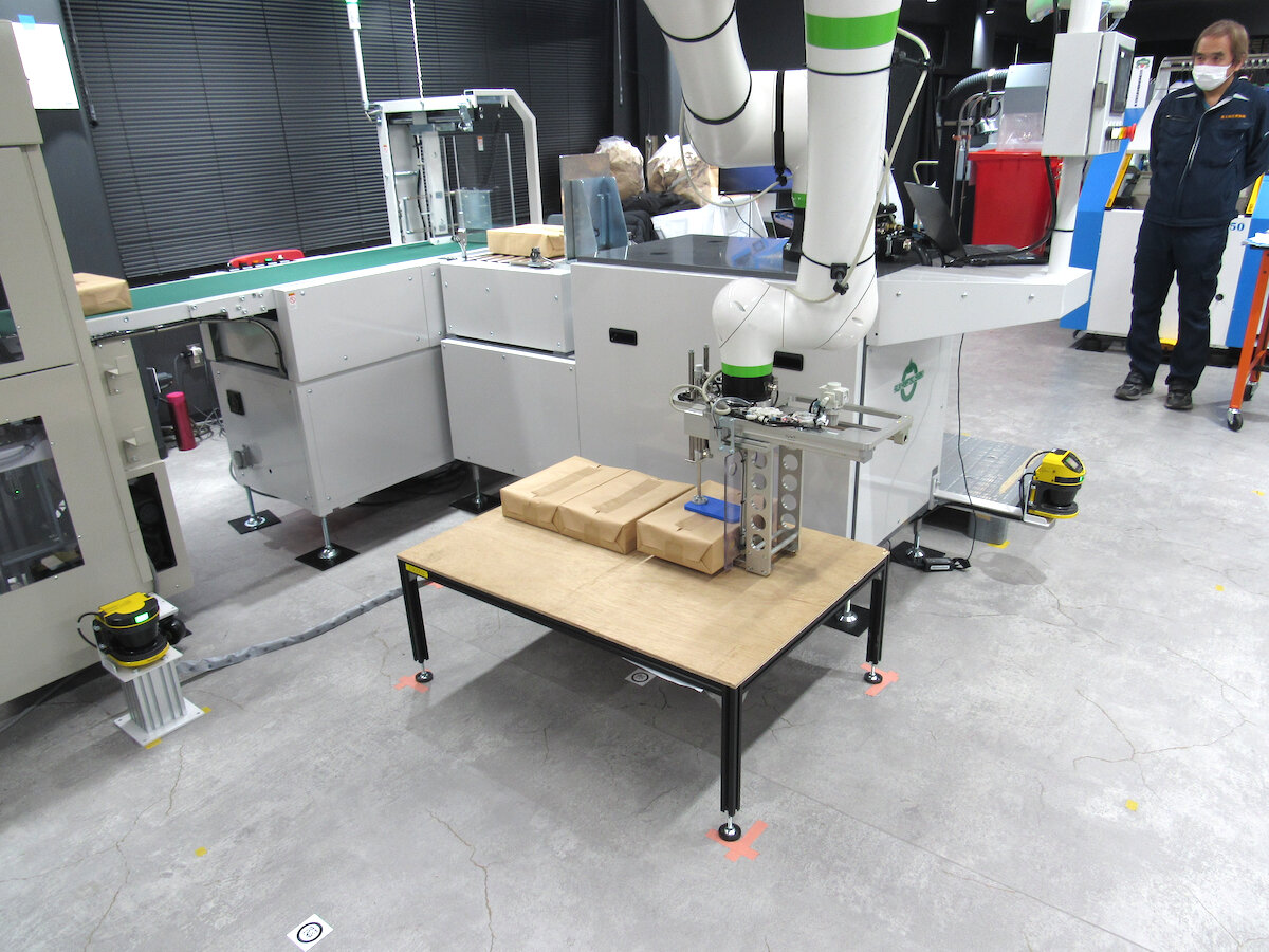 自動クラフト包装機は、並製本、上製本だけでなく中綴じ冊子やペラもの、のクラフト紙による自動包装が可能。展示モデルは、協働ロボットを活用したパレタイズシステムを連結し、クラフト梱包、パレタイズの自動化。パレタイズされたものは、AGVで自動搬送するまでの一連のデモを公開した。