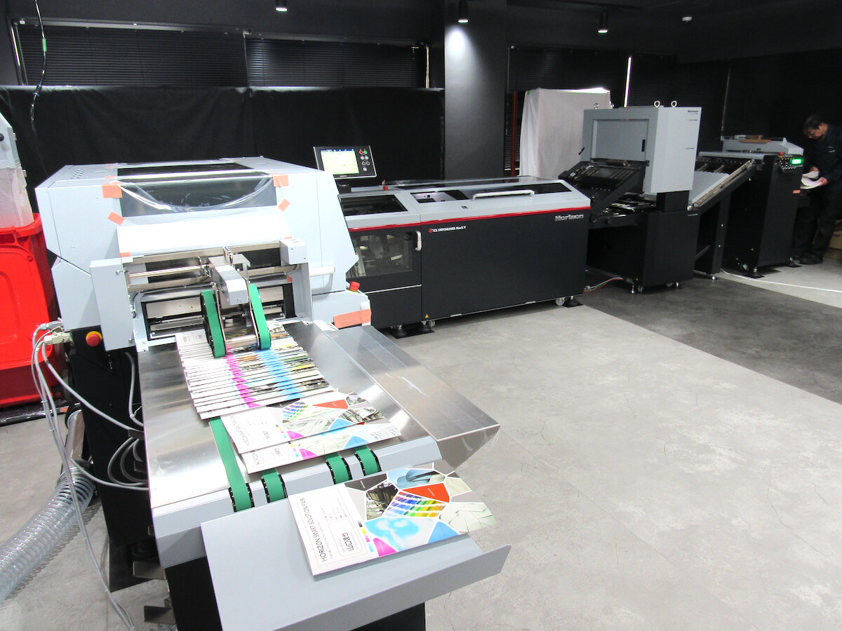 中綴じ製本からクラフト梱包までの自動化ソリューションでは、デジタル印刷向け中綴じシステム「iCE STITCHLINER Mark V」で製本後、富士油圧精機の自動クラフト包装機で包装する自動化ソリューションを披露。「iCE STITCHLINER Mark V」は、ロール紙とカット紙の給紙の切り替え(オプション装着時)が短時間で行えるため、さまざまなプリンターからの出力にフレキシブルに対応できる。