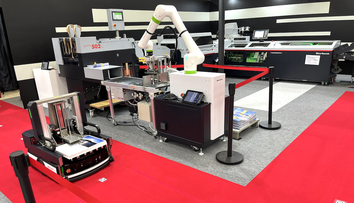 (株)ホリゾン・ジャパンは、印刷現場の無人化を実現するAGV連携中綴じシステム+帯掛け「iCE STITCHLINER Mark V + Palamides gamma502 HO Japan Edition