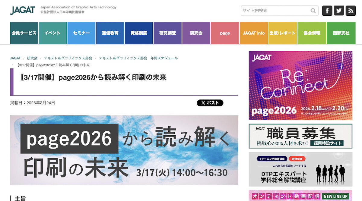(公社)日本印刷技術協会(JAGAT、網野勝彦会長)は3月17日、オンラインセミナー「page2026から読み解く印刷の未来」を開催する。