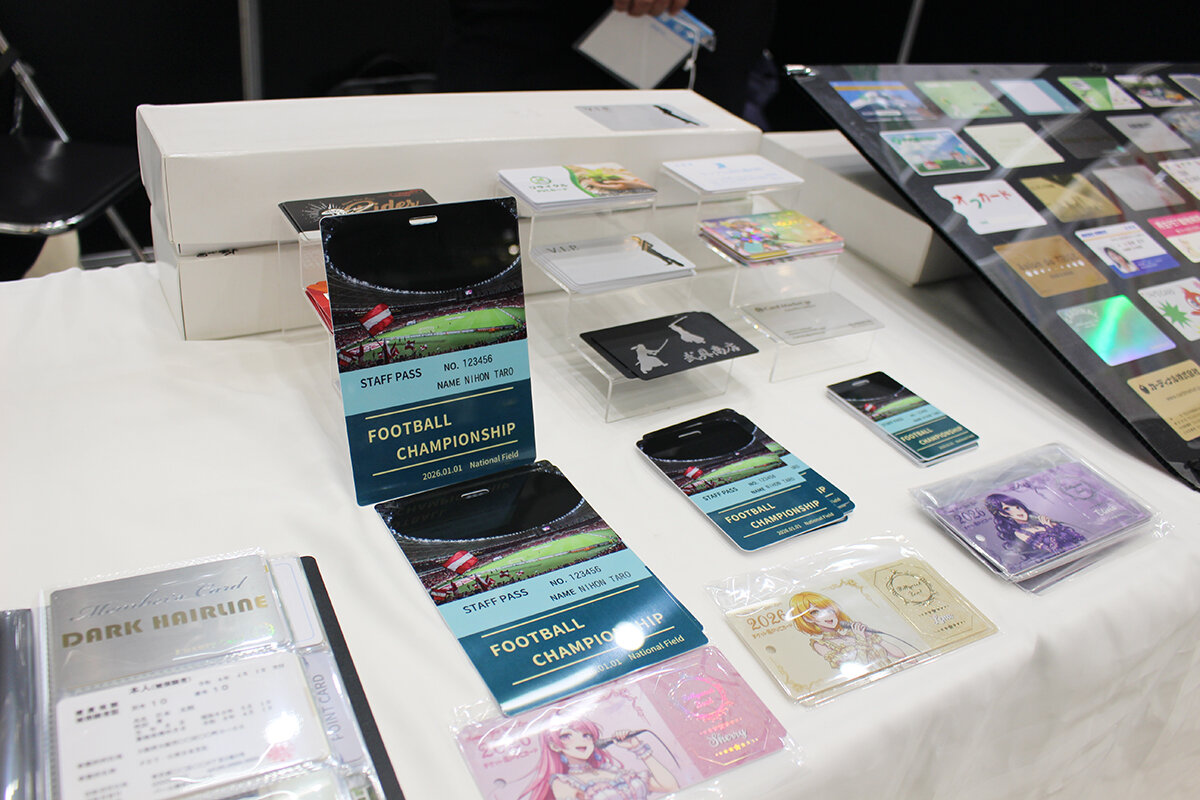 とくに今回、注目を集めたのはカード製造技術を応用した「イベント・スタッフパス」である。イベントスタッフ用のパスには様々な種類があるが、シール型は衣服に糊が残りやすく、バッジ型は布に穴が開く心配がある。一方、プラスチック製のパスは穴を開けて紐を通すことで、ピンや粘着剤を使わずに簡単に首から下げられる。また、プラスチックケースが不要のため、コスト削減にもつながる。
