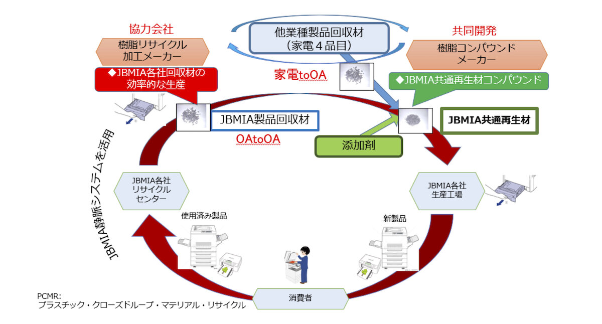 これまでPCMR(プラスチック・クローズドループ・マテリアル・リサイクル)は、個社ごとに実施され、業界全体での取り組みがなかった。今回、OA機器からOA機器への再利用(OA to OA)や家電からOA機器への再利用(家電 to OA)を対象としたPCR原料による業界共通の再生プラスチック開発および循環システムの構築に取り組むことで、今後さらにOA・IT機器業界におけるサーキュラーエコノミーの実現を推進していく。