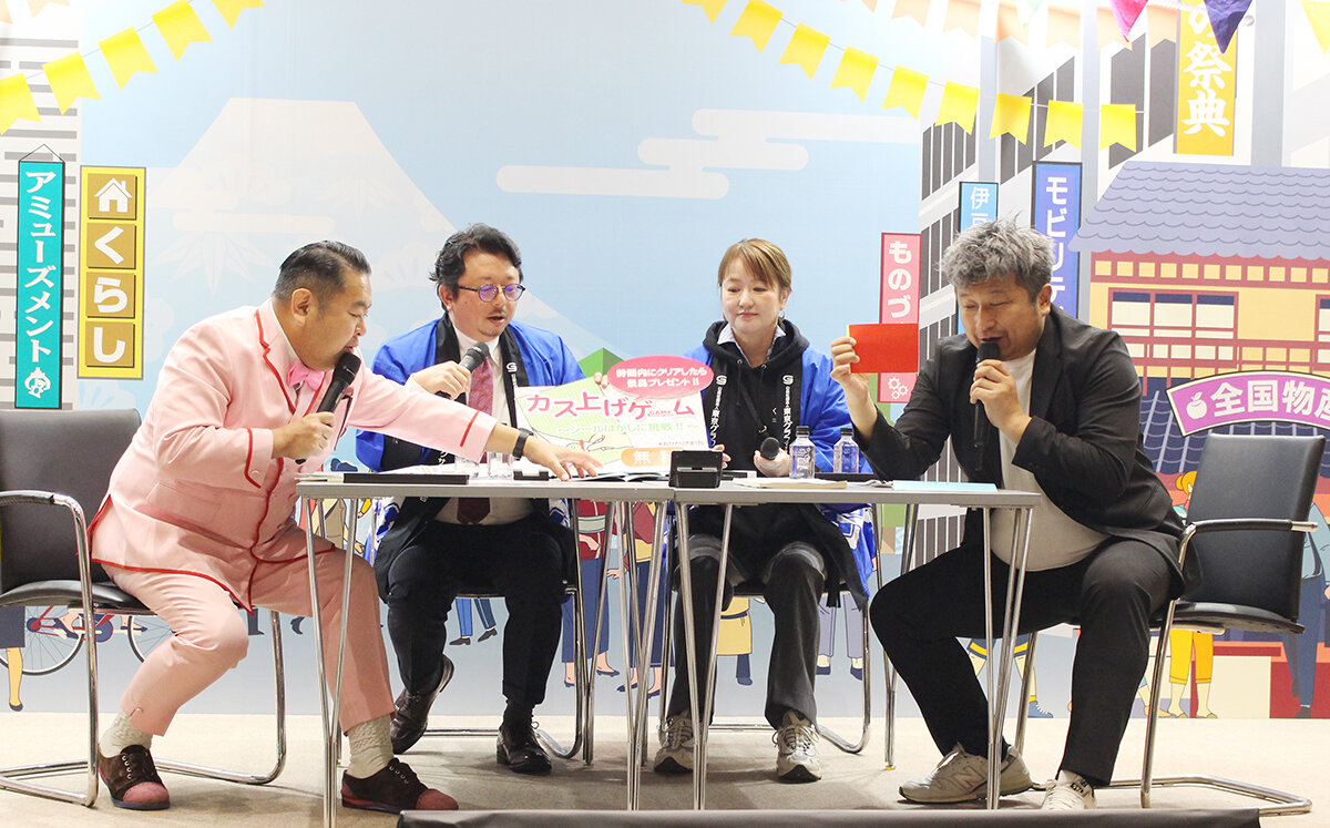 初日11時30分からは、原田会長と東グラ営業部の田中千佳子リーダー((株)昇文堂)がお笑い芸人ダイノジによる組合紹介イベントに登壇し、組合員企業の事業内容や組合の活動内容などのインタビューに回答した。また、ブースで好評の「カス上げゲーム」にダイノジも挑戦し、会場を盛り上げていた。