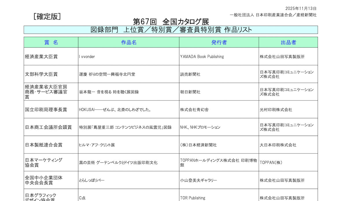 第67回全国カタログ展(主催=(一社)日本印刷産業連合会/産経新聞社)の入賞作品がこのほど決定した。