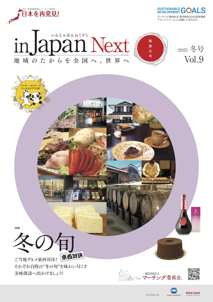 今回、発刊した「in Japan Next」Vol.9の特集は「冬の旬」と題し、東西のご当地グルメを紹介。各地域自慢の観光系情報から地域特産品などを掲載している。さらに同号では、かめおかマーチング委員会のJR嵯峨嵐山駅ポスタージャックと関西万博「森の京都」ブースでの展示、もばらマーチング委員会の「成熟社会の地域イノベーション」セミナー後の活動を紹介。