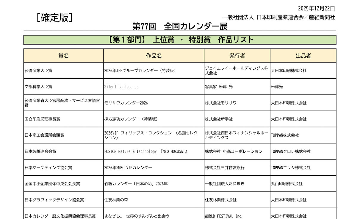 第77回全国カレンダー展(主催=(一社)日本印刷産業連合会/産経新聞社)の入賞作品がこのほど決定した。