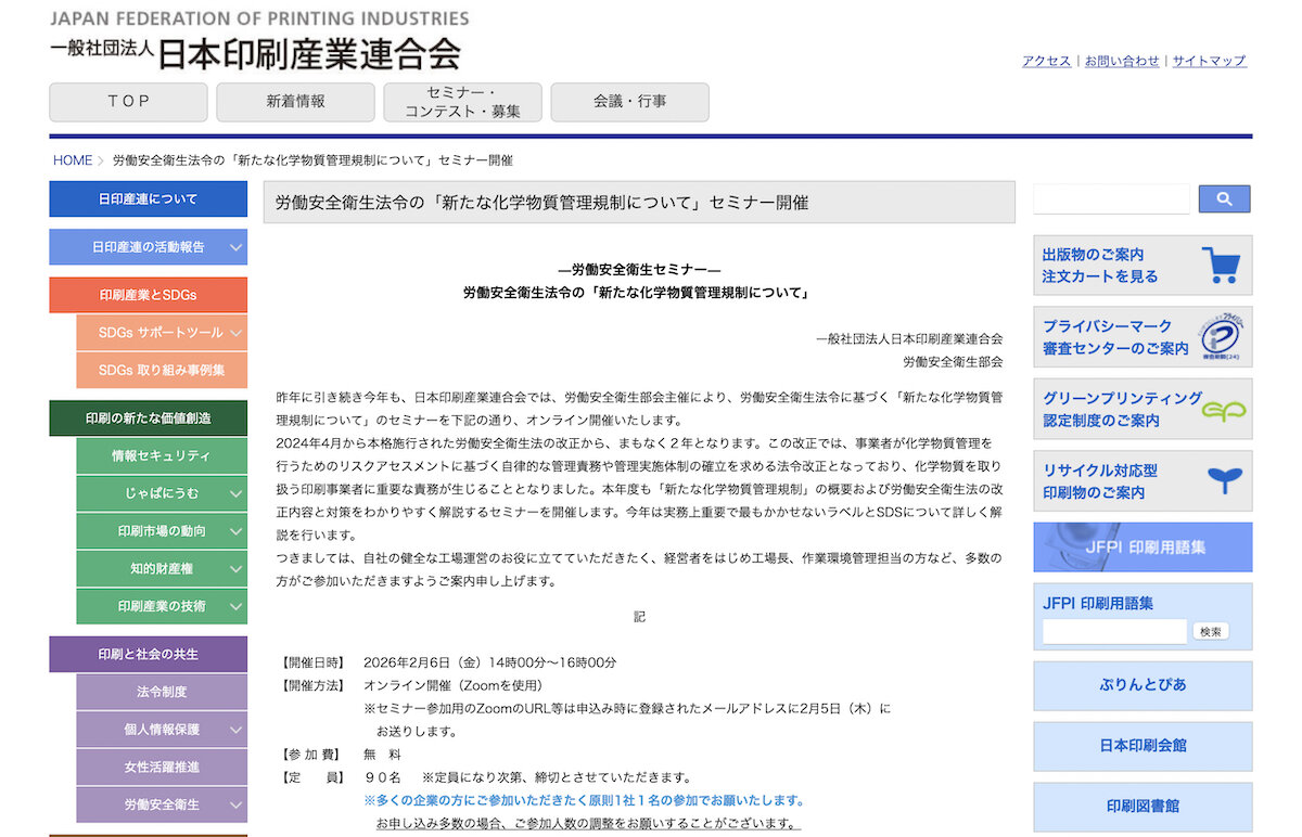 (一社)日本印刷産業連合会・労働安全衛生部会は2月6日、労働安全衛生法令の「新たな化学物質管理規制について」セミナーをオンラインで開催する。