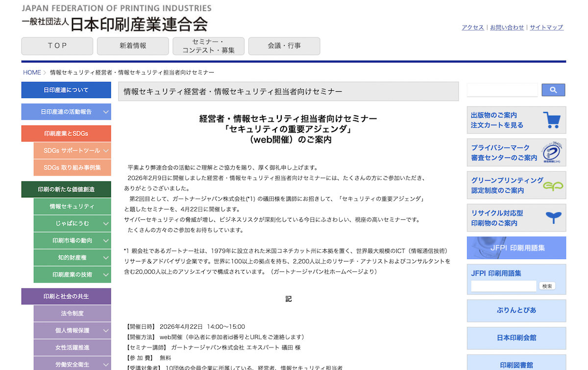 (一社)日本印刷産業連合会(日印産連)は4月22日、経営者・情報セキュリティ担当者向けセミナー「セキュリティの重要アジェンダ」をオンラインで開催する。