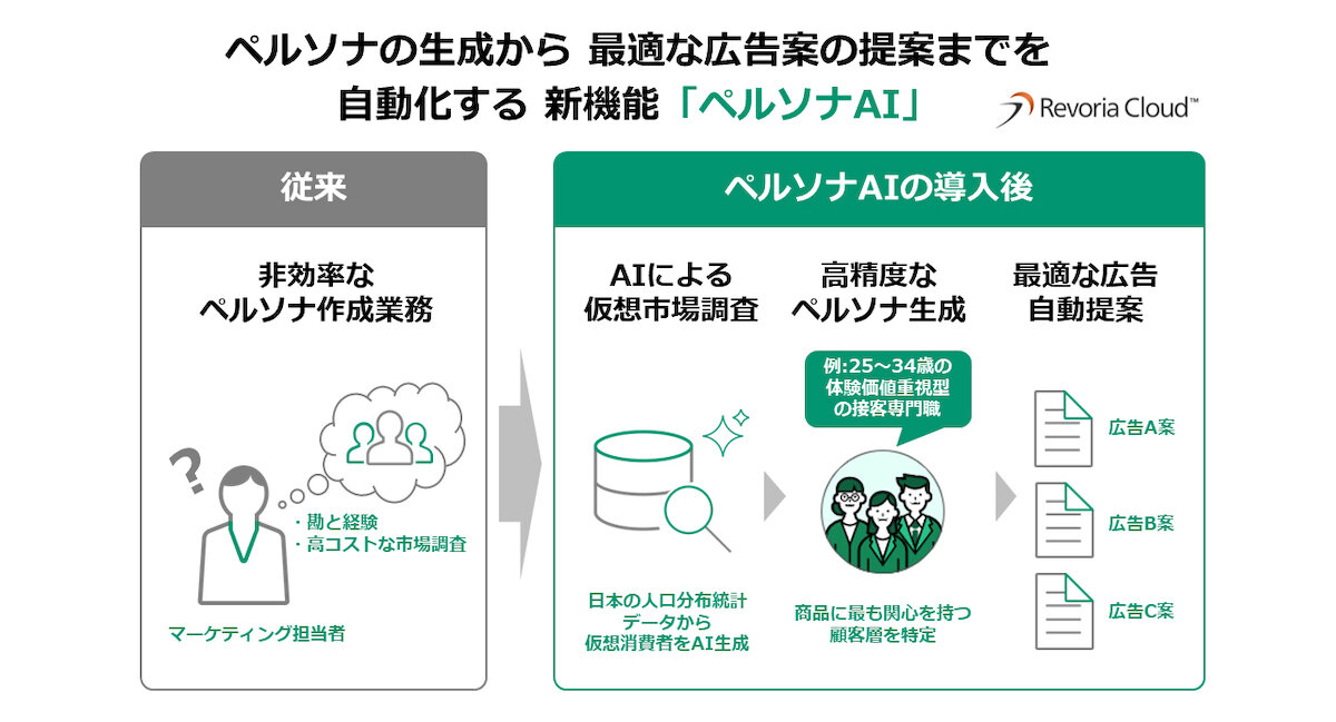 富士フイルムビジネスイノベーション(株)(本社/東京都港区、浜直樹社長・CEO)は、企業のマーケティングDXを支援するクラウド型マーケティングプラットフォーム「Revoria Cloud Marketing(レヴォリア クラウド マーケティング)」の新たなAI機能として、ペルソナの生成から最適な広告案の提案までを自動化する新機能「ペルソナAI」のベータ版の提供を1月8日より開始した。
