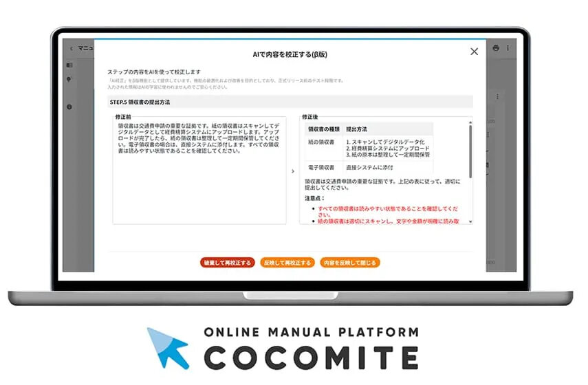 「COCOMITE」は、オンライン上でマニュアルの作成・共有・更新・管理ができるプラットフォームサービス。今回、試用を開始した機能は、マニュアルを作成する際、あらかじめ設定したルールに基づき、AIが自動で体裁を整えたり内容を補足したりすることで、マニュアルの品質管理・統制にかかる業務負荷を軽減するもの。