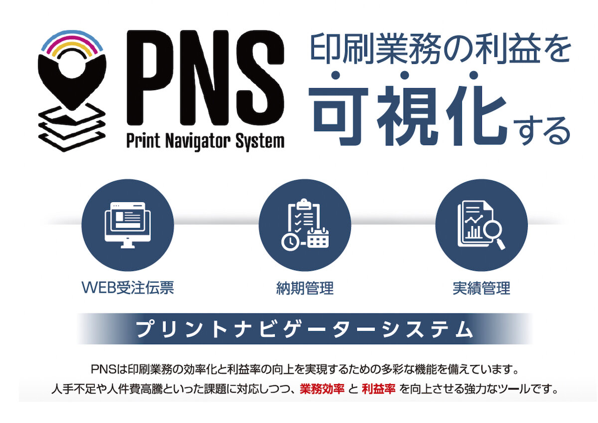 PNSは、見積・受注・利益管理を中心としたカスタマイズ可能な印刷業務向けMIS(受発注システム)。必要最小限の機能に絞ることで導入・運用負担を抑えながら、業務の可視化と収益改善を実現する。今後はAIとの連携も視野に入れている。