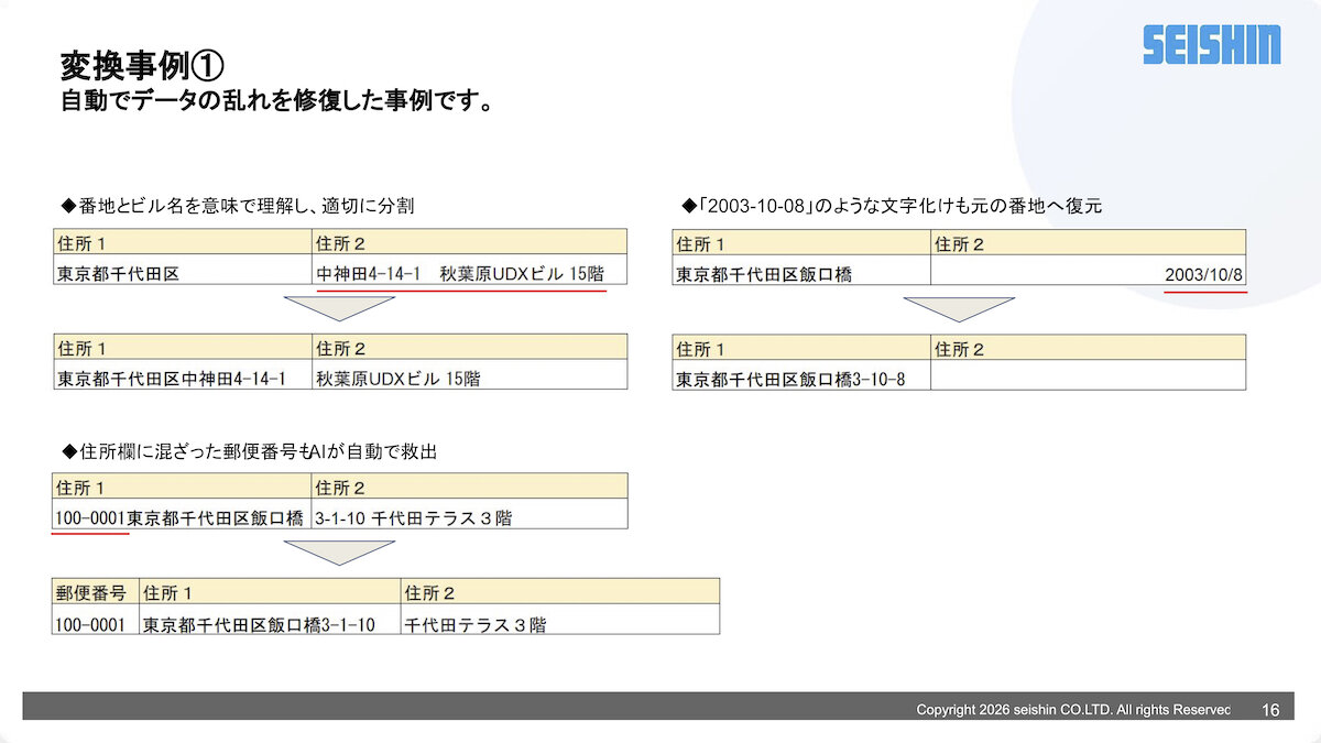 「Logi-Stream」は、AIが「住所」「氏名」「電話番号」などの項目を賢く判別し、自動でマッピング(紐付け)を実行するのでユーザーが手動で設定する必要はない。また、「市区町村」と「番地・建物名」の分割、マンション名の正確な処理を行うとともに住所欄に混入した郵便番号の分離や、Excel特有の日付変換バグ(「3-10-8」が「2003/10/8」になる等)も元の番地へ復元してくれる。さらに電話番号の桁数不足や文字数制限オーバーを事前に検知し、インポートエラーを未然に防ぐ。現時点で主要運送キャリアのフォーマットに対応しており、今後も順次拡大を予定している。